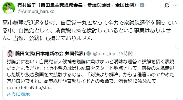 討論番組 ReHacQ の東京27区回でも、「消費税が12%という話が出ていると聞いた」という他党の候補者の質問に対し